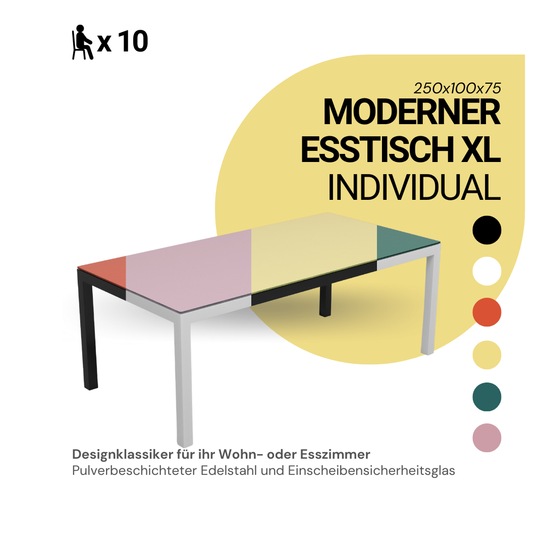 Dieser 250 cm lange Esstisch überzeugt durch seine beeindruckende Präsenz und bietet Platz für ausgedehnte Dinner und gemütliche Familienfeiern. Dieser beeindruckende Tisch bietet großzügigen Platz für bis zu 10 Personen und ist somit ideal für gesellige Runden und exklusive Veranstaltungen. Sein pulverbeschichteter Edelstahlrahmen (60 mm) und die Glasplatte in Ihrer Wunschfarbe vereinen zeitlose Formensprache und absolute Stabilität.