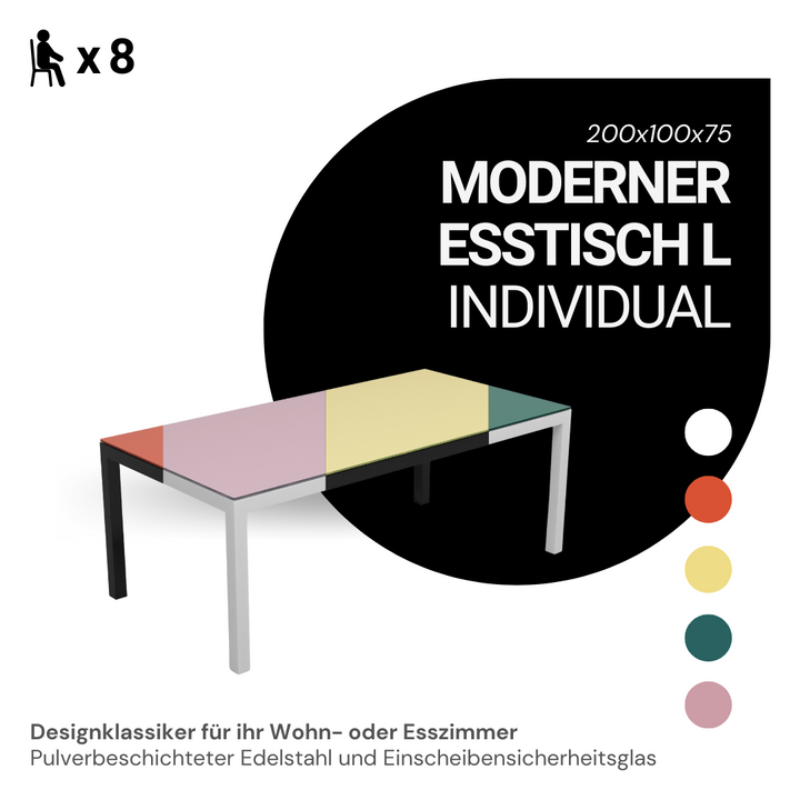 Mit einer Länge von 200 cm und einer Breite von 100 cm bietet dieser Esstisch ausgiebig Platz für gemütliche Runden und eindrucksvolle Dinnerpartys. Dieser beeindruckende Tisch bietet großzügigen Platz für bis zu 8 Personen und ist somit ideal für gesellige Runden und exklusive Veranstaltungen. Sein pulverbeschichteter Edelstahlrahmen (60 mm) und die Glasplatte in Ihrer Wunschfarbe vereinen zeitlose Formensprache und absolute Stabilität.